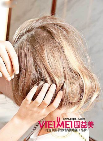 Step 1:将头发分为上下两部分,先将头顶部分夹起,下层的头发向内卷起,造成短发效果。