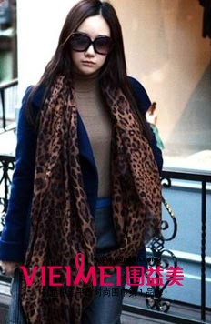 深色的豹纹围巾不但给人狂野的感觉,还有成熟的味道,随便地挂在脖子上做出凌乱的感觉,大方得体,很适合粉领们。