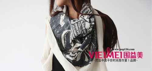 图案很个性的围巾,复古风格的图案,很独特,可以围成多种造型,搭配连衣裙或者小西装都是很适合的选择。