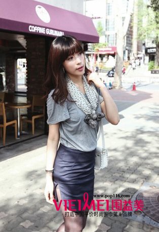 素色的Tee+紧身裙的组合,搭配一条波点围巾系在胸前,更显优雅。
