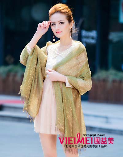 小编点评:金色亮眼款的丝巾,流苏设计个性十足,做成披肩搭配连衣裙,享受尊贵典雅的生活气息吧!