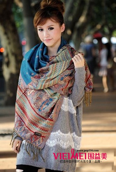 围巾披肩,精致而细腻的花纹,呈现出不凡的时尚品味,鲜明的色彩,尽显高贵感,精巧而细腻的流苏设计,充满了可爱而时尚的新颖感。