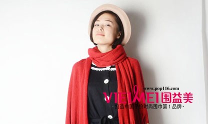 有好多毛线球球的大红围巾俏皮时尚,有点像魔法师的大斗篷。