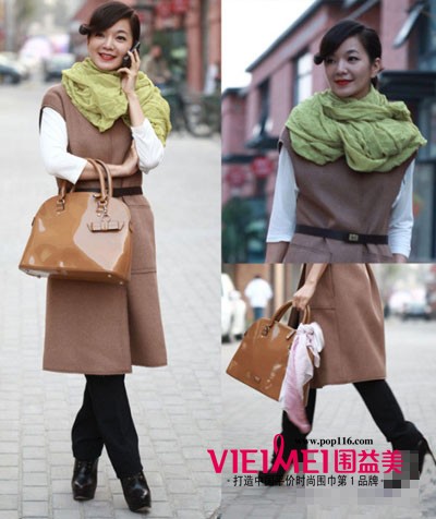 白色七分袖打底衫+棕色无袖连身裙+淡绿色围巾