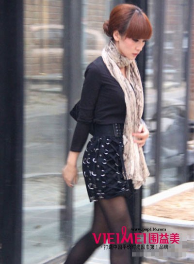 黑色短裙+蛇纹围巾+太阳镜+黑色斜跨包+黑色露脚趾厚底楔形鞋+黑色丝袜,全身上下都是黑色,性感大气,独有自己的时尚魅力,还能穿出好身材。蛇纹围巾点缀,异常出彩。