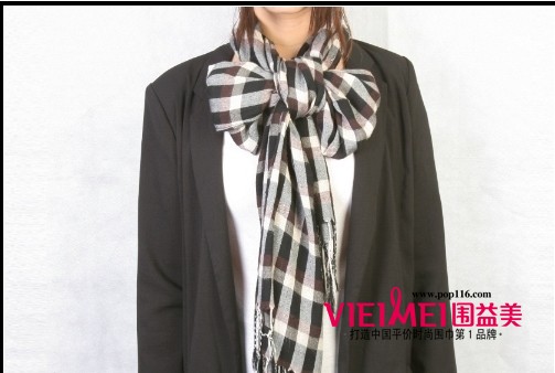 适合大蝴蝶结推荐围巾二:咖啡色暗格子的流苏围巾。古朴的色调打一个略显夸张的大蝴蝶结,也让围巾有个性起来。