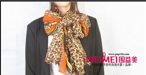 适合大蝴蝶结推荐围巾五:时尚豹纹两端用扎染效果的围巾。长围巾可以让蝴蝶的“翅膀”长一些,会有一不样的效果哦。