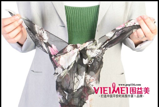 第二步:将另外两个没有系结的丝巾角,相互交叉从系结的两端空隙中穿出。