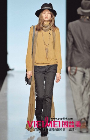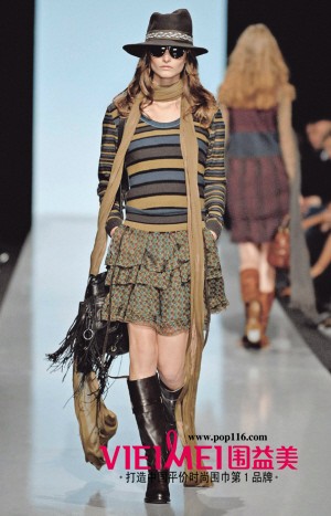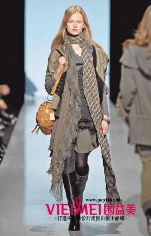 而今年秋冬,T台上流行好长好长的长围巾,挂在那些高个子模特的脖颈上悬挂下来直及地面,很波西米亚的风格,围巾突然不再是配饰,而成了醒目的主角。想来这也是配饰超大型潮流的一种,什么都要大、加大,围巾自然也是一长再长。