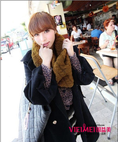 黑色呢子大衣,厚实的质地保暖性很高,收腰的设计与花瓣领子配可爱灯笼袖,配上大大的驼色编织围脖,让时尚与温暖都紧紧的包围在身上。