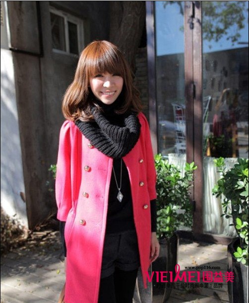 七分袖的羊毛外套手感很足,金属色的双排扣与糖果般的西瓜红十分相配,特别适合年轻时尚女生穿着。