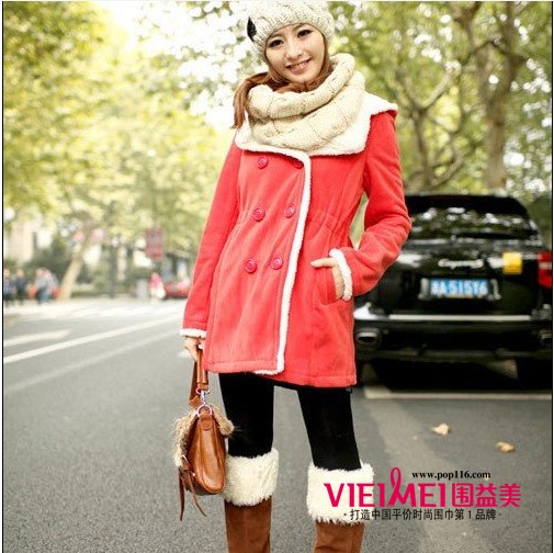 软软的珊瑚绒面料外套,配上白色的羊羔绒边与领子,感觉很是温暖,而杏色有双层围脖的保暖性也很有。