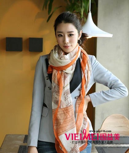 简洁清爽的西装外套,搭配桔色系印花丝巾,为中性色彩的装扮增加一抹亮色。