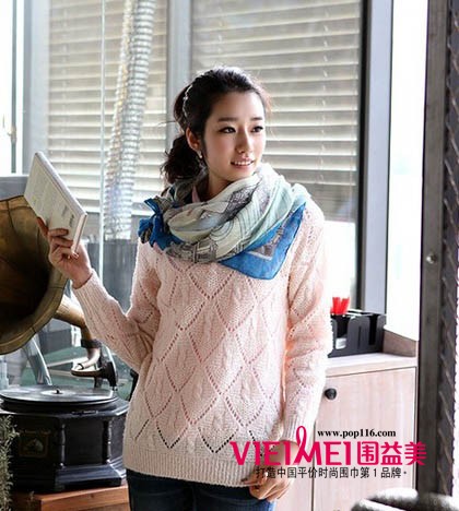 同样花色的丝巾,清爽的蓝色系,搭配在粉色毛衣上,突出色彩的靓丽,尽显春意。