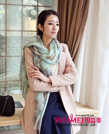 淡绿色丝巾,与粉色西装外套搭配,戴出春天的清爽与靓丽。