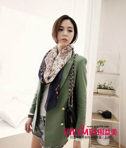 百搭的蓝色印花丝巾,搭配今春最帅性的西装与牛仔短裤组合,时尚个性女人味十足。