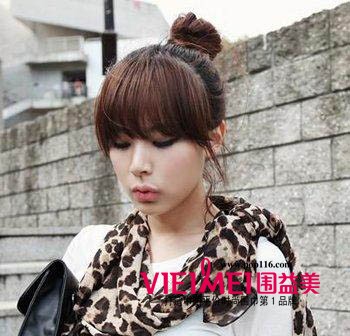 丸子头+围巾 超级甜美可爱的丸子头搭配围巾,当然是最佳妙搭啦。丸子头高高扎起,给人一种非常清爽的感觉,带出女生俏皮可人的气质。齐刘海打造稍稍蓬松效果,让整个发型增加灵动感,同时也把女生的脸型衬托得更加小巧精致。搭配很百搭的豹纹围巾,时尚又清甜可人。