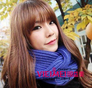 长发+围巾 飘逸的长发搭配围巾,是不是觉得有点累赘的感觉呢?只要把长发打薄,就会显得轻盈又飘 逸,染上深棕色发色,增添时尚感和空气感。细碎的齐刘海让整个发型显得更加清爽,所以 戴上臃肿的围巾,还是一样完美。