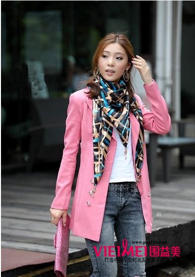 小编点评:气质井字格子真丝三角丝巾,搭配长款OL职业小西装,完美的凸显了女性干练的魅力与气质,合成围在脖子间非常的有亮点,也适合平日出街装扮。
