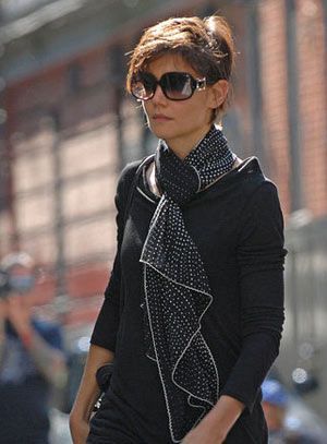 很多围巾都是正反面不同图案的,但阿汤嫂这条围巾利用细微的变化打造颜色的对比从而形成对比,只是一条围巾的加入就让平庸的黑色上衣有款有形。