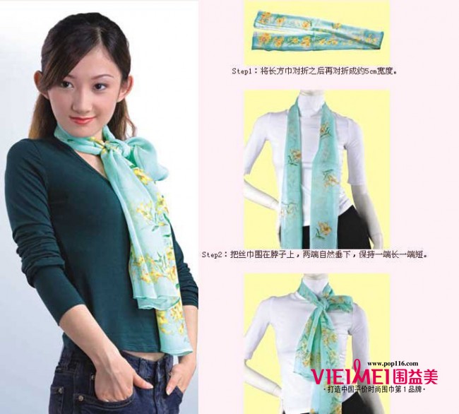 花色图案简单的丝巾,搭配清爽利落的上衣,再加上铅笔裙和丽人小皮鞋,既有女人的斯文又有女生的可爱,绝对成为办公室里的人气美女。是不是很羡慕,不用为年龄担心,你也可以轻松穿出20的风采,丝巾四种系法让你进级时尚达人。