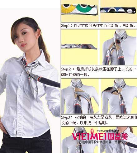 丝巾领带上圆形和方块的组合打破白衬衫的沉闷单调,再加上合身长裤,给人专业干练的形象 时尚解析:这种打法需要两条方巾和一个木环(或戒指)相互搭配才能完成,感觉飘逸自然,令普通的衣服立马变成各种聚会,特别是舞会的最佳服饰。这可是日本潮流教主滨崎步的经典装扮,戴着它去dancing吧,你是舞池里独一无二的star!