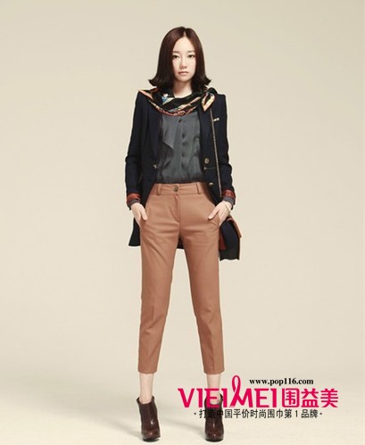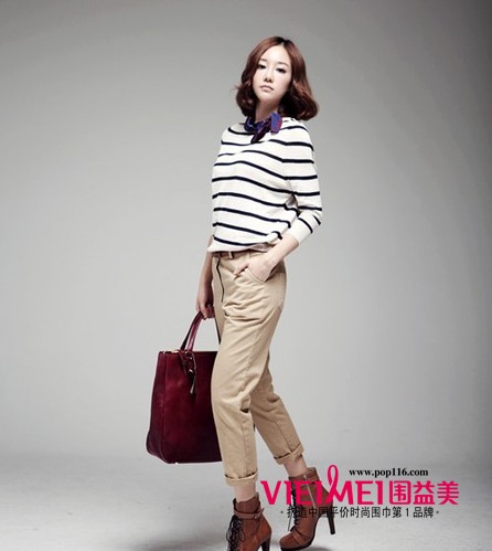 很简约的搭配,黑白条纹T恤简洁明快,米色休闲裤比较宽松,穿着起来十分舒适,可将裤腿卷起显得更加随意,小巧的蓝紫色方巾不太显眼却是整体不可缺少的一部分,他给形象增添了成熟的感觉,蓝紫色跟玫瑰红交错,让这身浅色服装搭配也具备了成熟女性该有的沉稳。