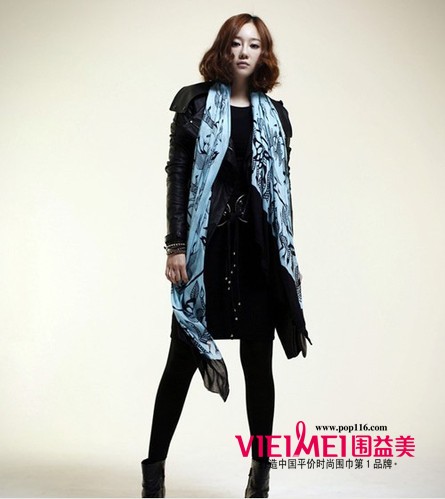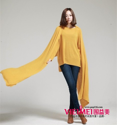 很时尚的一款针织围巾,很长很宽,裹起来可以当脖套搭配服装,颜色跟上衣是同一颜色,显得整体感非常强,搭上蓝色仔裤清新又亮丽,极具休闲感。