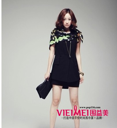 黑色长版背心搭上同色短裙,简洁干练,背心不是很修型,穿脱都很方便,不会有拘束感,带有鲜亮色彩的黑色方巾是全身的亮点,光鲜亮丽的色彩相当引人瞩目,可以像这样裹肩装饰也可以直接系在脖子上,都很好看。