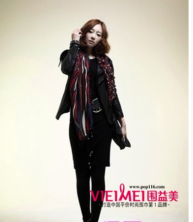 黑色的夹克剪裁修身得体,叠领的设计让其显得高贵有韵味,裹身的黑色半裙更显性感魅力,半裙上零星的白色珍珠点缀跟束腰式宽腰带让下半身显得修长华美,红、白、黑相间的纱巾更显熟女气质,前半部为点状印花,后半部为条状印花,点状与条状的结合让丝巾的质感显得有紧有松,给人于众不同的感官感受。