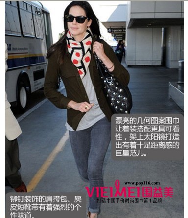 围巾能很好的转移注意力,从而有拯救粗壮手臂的功效,设计简洁线条流畅的大围巾还能增加层次感,使身形略显苗条。醒目大耳环能把焦点集中在头部,围巾+大耳环堪称上半身的造型亮点。迷彩的大围巾,虽说迷彩有点男性化,但是恰到好处的深度让迷彩更帅性又不失女人味,还加入了流行了流苏元素;犹如古钱币图案的大吊坠耳环更是让人瞬间就目光吸引。