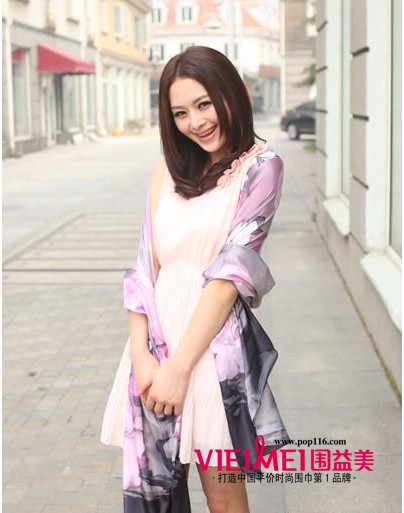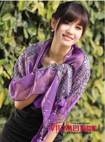 小编点评:生灵活气,紫色魅力,紫色是颜色当中最具魅力的一种色彩,紫色的丝巾也不列外,系上去非常的有魅力。