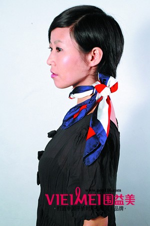 色调鲜亮的丝巾直接束裹在颈间,并将蝴蝶结打在一侧,犹如空姐般的造型青春而不失端庄。适合搭配素色低领合身上衣,选用光泽感强的丝巾并将其尽量绷紧,使丝巾表面平滑光洁没有褶皱,颈侧的蝴蝶结不宜打得太大,以免给人慵散的印象。