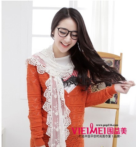 唯美钩花波浪边,精美的蕾丝,无不在诠释淑女公主风,简单围上一圈,可以弥补V领针织外套的胸前的空白。