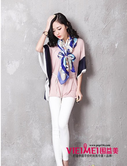 清新灵动的薄荷蓝拼上纯白色,在脖子间跳跃,将时尚和完美结合在一起,搭配无袖印花连衣裙,围巾的长度不要长于裙子,避免累赘感。