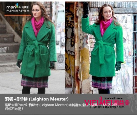 莉顿·梅斯特(Leighton Meester) 穿黛安·冯芙丝汀宝(Diane von Furstenberg) 绿色羊毛大衣、Milly羊毛格子裙、黑色手套、撞色高跟鞋,然后用一条鲜艳的桃红色围巾与绿色大衣制造对比,完成她的整个撞色LOOK。