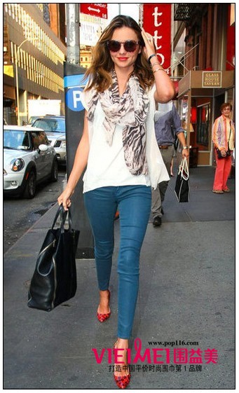 米兰达-可儿黑超遮面大秀笑颜,一条斑马纹围巾迅速聚焦视线。斑马纹相比豹纹,黑白相间的斑马纹似乎更为高调,也是永不褪色的流行之一,有些人把黑白条纹也叫做斑马纹,但那些不规则条纹,更接近斑马本身皮色的纹路,才能体现出动物的一些粗犷味,性感而抢眼。相信将来类似的变形豹纹、斑马纹都将受到热捧。