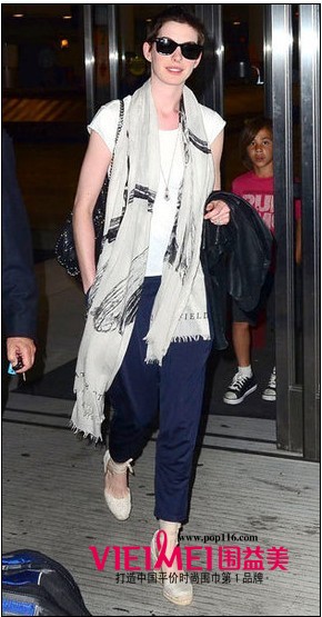 安妮-海瑟薇扎染长围巾飘逸出街,Stella McCartney拉链包低调