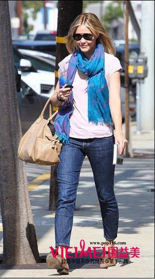 莱丝莉-比伯粉色Tee+蓝色围巾,驼色YSL包包呼应麂皮平底鞋大吹西部风
