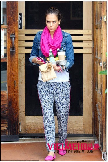 杰西卡-阿尔芭(Jessica Alba)在老公的专车护送下来到咖啡店买早餐,桃色围巾配对蓝色短款外套,桃色平底鞋与围巾互相呼应!
