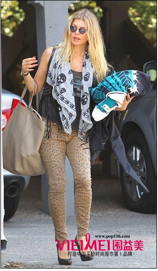 菲姬豹纹窄腿裤+McQueen骷髅丝巾 黑超遮面酷劲十足,骷髅图案是小编最爱的图案之一,一种霸气的感觉油然而生,个性不失性感。