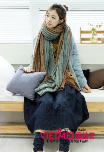 驼色毛衣外搭粉蓝色毛衣外套,驼色与蓝色两条围巾营造撞色与厚重的感觉,下身搭配丹宁风半身裙,加上蓝色长筒袜以及毛毛球麂皮鞋,打造清新的森女范儿