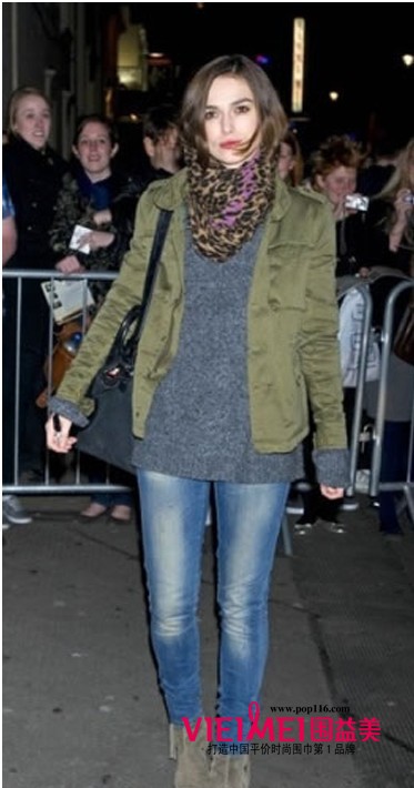 凯拉•奈特利短款的军绿色外套搭配灰色的长款毛衣,将毛衣的袖子露在外套的外面,体现一种随意感与层次感。下半身穿上蓝色的牛仔裤和卡其色的短靴,整体色彩搭配十分协调。而一款豹纹围巾的选择就是潮感的展现了,繁复的图案打破一身纯色搭配。围巾的系法图解是绕成围脖式的形状,但是稍微有点垂坠的效果。
