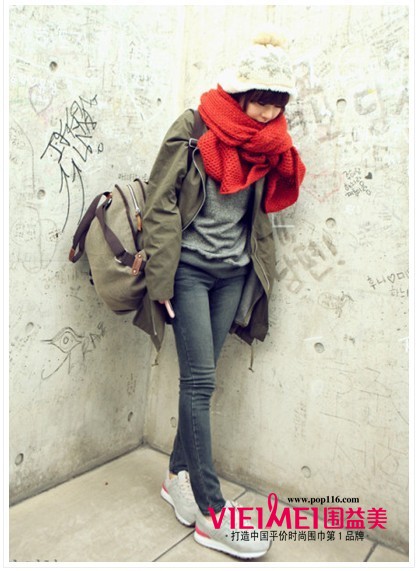 军绿色外套搭配红色围巾的系法图解,将围巾随意地打个结,宽松的感觉才突出潮感。