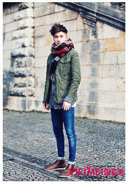 男生也喜欢军绿色外套搭配围巾,一款彩色拼接围巾,绕几圈后,留有短短一端在衣身前,干练利落。
