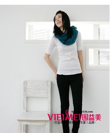 湖绿色围巾搭配无彩色上装给人以唯美的时尚清透感觉。