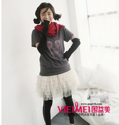 深红色围巾搭配灰色骷髅头上装与白色裙子多种元素相混合,达人的最爱装扮。