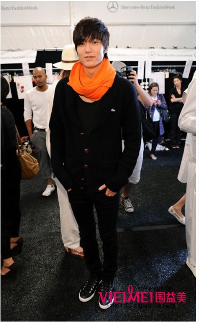 李民浩如今已经是很多少女追捧的韩国男星,人气爆棚。经常出席活动的他,穿衣打扮自然也成为焦点。春季到来,李民浩穿上一款黑色的V领针织衫,下半身搭配黑色的修身裤,显出高挑的好身材。一双黑色的皮质休闲鞋穿出帅气的感觉。一身黑色虽然很酷,但是少了春日的气息。所以一款橙色的围脖搭配,展现出潮人的魅力。这款围巾的系法图解是将围脖绕成圆圈挂在脖子上,与里面穿着的圆领针织衫协调搭配。