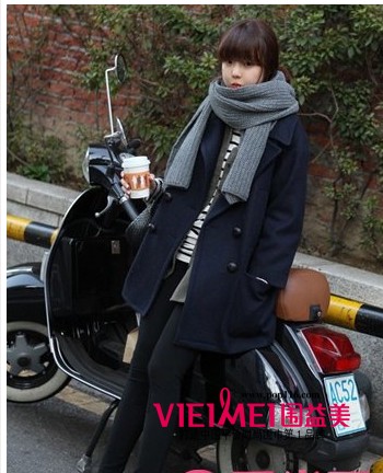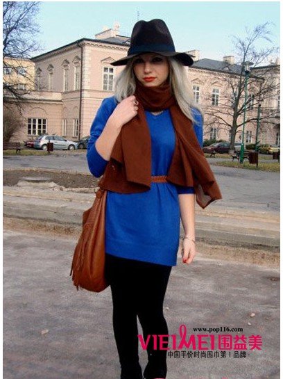 今冬流行围巾不妨选择纯色系的围巾,这一款深棕色的围巾搭配宝蓝色的长款毛衣和黑色裤袜,系上腰带,也很好看。