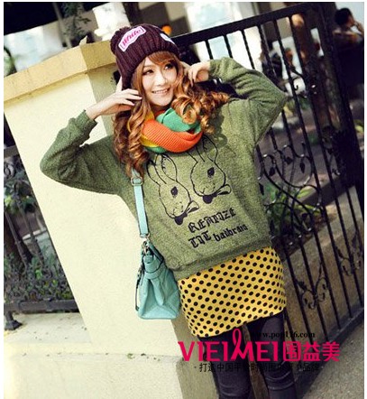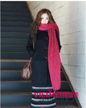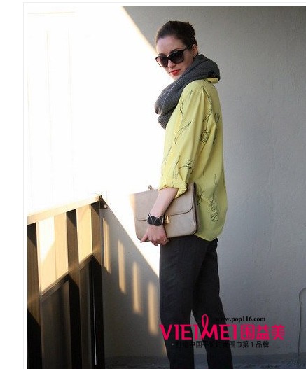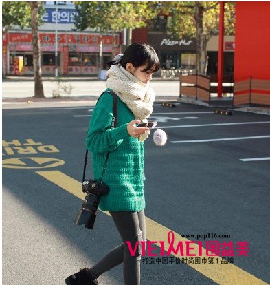 撞色的围巾也是今冬流行围巾的主打款式,橙色、绿色、黄色三种明亮又温馨的色彩拼接在一起,让人一见心情就感到愉悦,特别适合走可爱路线的女生搭配。就像这位MM穿上军绿色的兔子图案毛衣,搭配黄色的波点短裙,肩上的包包也是比较亮眼的湖绿色,一款彩色的围巾就是点睛的搭配,只要绕着脖子几圈,呈现厚重重叠的感觉,就能将整身搭配提升到更和谐的视觉效果。